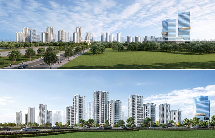項目總規(guī)劃用地1405畝,包含住宅、商業(yè)、教育、醫(yī)療、公園綠地等13類用地,其中,公建用地規(guī)劃于中心區(qū)域,沿環(huán)城水系兩岸,形成兩大服務(wù)設(shè)施中心,住宅呈環(huán)抱姿態(tài)分布于配套周圍。本次匯報范圍是東京北回遷區(qū)域首開區(qū)與二期地塊。項目規(guī)劃總建筑面積約74萬平方米,其中地上建筑面積約52萬平方米,地下建筑面積約22萬平方米,規(guī)劃設(shè)計49棟住宅樓,兩所中小學(xué),兩所幼兒園,一座商業(yè)綜合體,其他各項指標(biāo)均符合規(guī)劃要求。