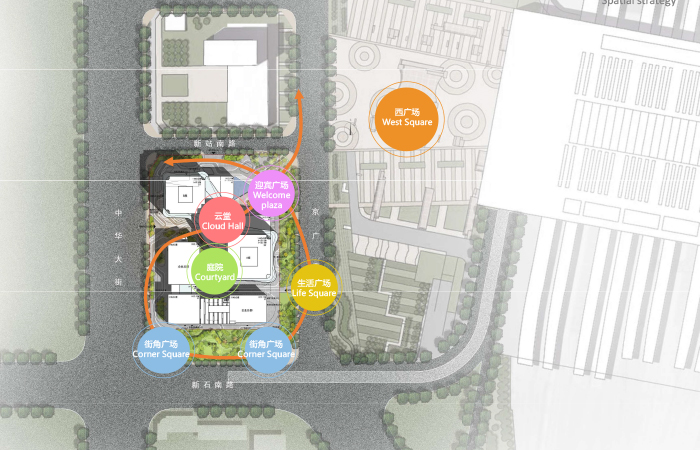 南側(cè)企業(yè)總部以L型高低錯落布局呼應(yīng)塔樓形態(tài),創(chuàng)建公園式辦公組群,有機(jī)銜接場地周邊綠地景觀,營造活力多樣化的景觀空間。中華大街沿線結(jié)合周邊組團(tuán),形成層次豐富、舒緩延展的優(yōu)美天際線。