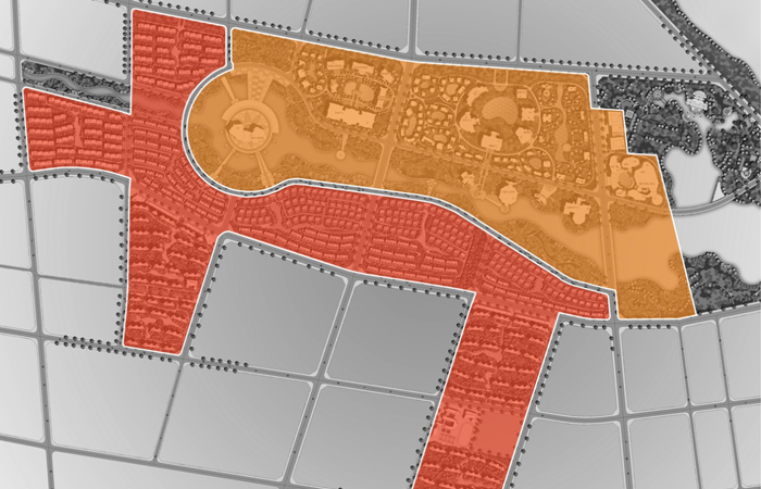 靠近景區(qū)的東北側(cè)區(qū)域規(guī)劃為公建區(qū),更好的與景區(qū)相結(jié)合;西南側(cè)區(qū)域規(guī)劃為住宅區(qū),氛圍相對(duì)安靜。兩大區(qū)域以中心景觀帶相分隔,實(shí)現(xiàn)各自獨(dú)立。