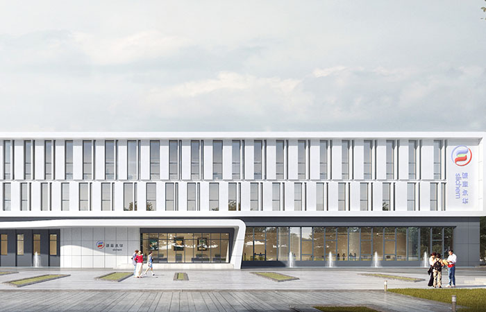 本工程為滄州誠志永華科技有限公司新型顯示材料項目,位于滄州渤海新區(qū)臨港經濟技術開發(fā)區(qū)。定位為現代建筑風格,以現代產業(yè)企業(yè)的辦公趨勢和需求為依據,本著加強協(xié)作交流、激化創(chuàng)意思維、促進身心健康高效工作環(huán)境的原則,以個性化和以人為本的設計,塑造現代企業(yè)形象。方案設計以現代科技、交流共享為主題核心,打破傳統(tǒng)封閉的辦公模式和刻板印象,塑造具有企業(yè)專屬感的標識形態(tài)。在滿足基本功能空間之外,打造舒適的交互性空間,進一步促進各種協(xié)作與交流。在規(guī)劃設計中,強調建筑與周邊環(huán)境的有機融合,注重城市風貌建設,同時內部打造連貫性景觀,開闊視野。單體設計形象統(tǒng)一完整,細部處理簡潔,手法運用注重人性化,開放,友善親和的建筑性格。在處理廠工藝流程上,充分尊重其工藝設計的功能性要求并在此基礎上注重設計語言的完善,強調廠區(qū)的風格特征。建構筑物在綠色、和諧、美觀之外,結合科學、潔凈的概念,在其藝術的美感之外,保證其標志性。