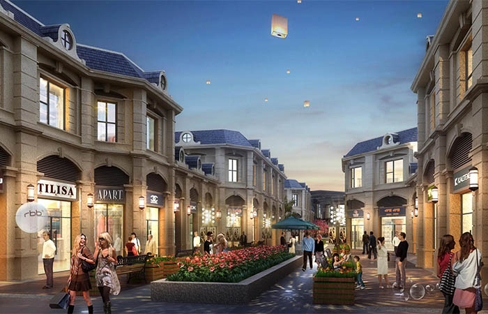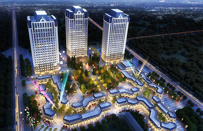 規(guī)劃布局南高北低,風(fēng)情商業(yè)街區(qū)與高層之間以中央巨大的城市開放公園有機(jī)連接,從橫向和縱向雙重尺度與城市進(jìn)行對話,為城市帶來活力的城市空間。高層立面采用端莊典雅的法式風(fēng)格,主體采用米黃色真石漆外飾面,基座采用淺咖色石材,與藍(lán)色屋頂?shù)南嘟Y(jié)合,輔以弧形開窗,法式雕花。低層商業(yè)街同樣采用經(jīng)典的法式風(fēng)格,歐式的線腳,弧形的門窗,法式的欄桿,藍(lán)色瓦屋面,展現(xiàn)出濃濃的法式韻味。商業(yè)街建筑的高低錯落,結(jié)合靈動的商業(yè)流線,營造出充滿活力的商業(yè)氣息。
