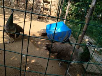 籠中的孔雀可以喂,隨手摘片草葉,孔雀就會過來吃,公孔雀在房間內(nèi)不出來,不知道是怕熱還是在守護可愛的、剛孵出來的小孔雀?